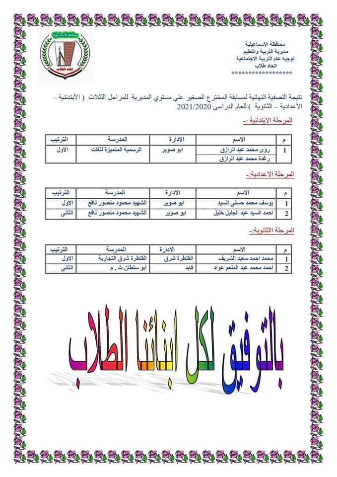 وتم تحقيق هذين الإنجازين السابقين، بفضل توجيهات طه عجلان، وكيل وزارة التربية والتعليم بالإسماعيلية، وعماد عنتر مدير الإدارة التعليمية بالقنطرة شرق، وإيهاب محمد أحمد مدير المدرسة، وجميع أفراد عناصر المنظومة التعليمية بالمدرسة؛ من وكلاء ومعلمين وإخصائيين وعمال.