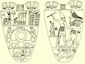 وتحتوي صلاية نعرمر(الصلاية هي لوح من الحجر اتخذه المصريون لطحن الكحل وبعض مواد الصباغة، ثم اتخذوه بعد ذلك لوحًا يدونون عليه بعض حوادثهم التاريخية)، على بعض النقوش الهيروغليفية المبكرة وتصور اللوحة الحدث الخاص بتوحيد مصر العليا والسفلى في عهد الملك نعرمر.