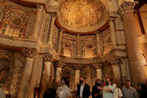 وقد استقبلت قيادة الكنيسة السفير جوناثان كوهين لدى وصوله إلى الدير الأحمر ثم بدأ زيارته للموقع حيث شاهد اللوحات الجدارية للكنيسة، والتي تم تنظيفها وترميمها من قبل مركز الأبحاث الأمريكي في مصر (ARCE) بتمويل من الحكومة الأمريكية بقيمة 3.6 مليون دولار عن طريق الوكالة الأمريكية للتنمية الدولية (USAID). وهذه اللوحات الجدارية هي اللوحات الكاملة الوحيدة التي تعود إلى العصور الوسطى والتي بقيت في مصر بشكلها الأصلي.