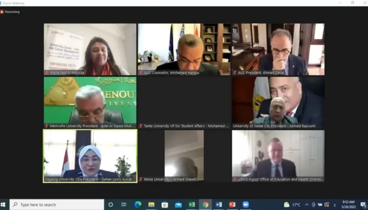 شاركت الدكتورة جيهان يسري نائب رئيس جامعة الزقازيق لشئون خدمة المجتمع وتنمية البيئة نيابة عن الأستاذ الدكتور عثمان شعلان رئيس الجامعة في حفل إطلاق فاعليات الملتقى الإفتراضي الثالث للتوظيف للجامعات المصرية والذي أقيم اليوم الإثنين 28 مارس ٢٠٢٢ ، بالفيديو كونفرانس بحضور رؤساء عشر جامعات حكومية مصرية هي الإسكندرية، أسوان، بني سويف، السادات، سوهاج، الزقازيق، عين شمس، طنطا، المنصورة، المنوفية، والمنيا. وحضور السيد ويك باورز، مدير مكتب التعليم والصحة بالوكالة الأمريكية للتنمية الدولي بمصر ، والدكتور أحمد دلال رئيس الجامعة الأمريكية بالقاهرة والدكتور محمد حمزة مستشار الجامعة الأمريكية .
