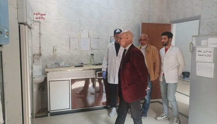 بدأ وكيل الوزارة جولته بتفقد بنك الدم التجميعي، لتقييم تنفيذ التوجيهات التي أصدرها خلال زيارته السابقة بفصل خط سير المترددين على البنك عن خط سير العاملين، وعمل باب خارجي يسمح بمرور المترددين من وإلى البنك بشكل مستقل، كما قام بمناظرة الثلاجات، موجها بالأستخدام الأمثل لها، وتشغيلها وفقا لكمية المخزون المتواجد من الدم ومشتقاته، كما اطلع على السجلات الخاصة ببنك الدم للتأكد من استيفاء تدوين البيانات.