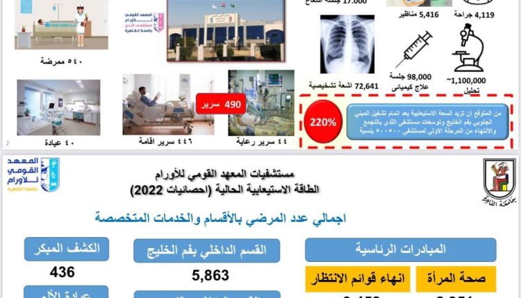 وأكد التقرير أنه تم استقبال نحو 315 ألف مريض خلال عام 2022 بزيادة 26 ألف و500 مريض بعد إجراء عدد من التوسعات والتطوير بالمعهد ومستشفى أورام الثدي بالتجمع، مشيرا إلى أن المعهد يضم 860 عضو هيئة تدريس و540 هيئة التمريض، ويتم استقبال وعلاج المرضى من خلال 40 عيادة طبية في كافة التخصصات الخاصة بالأورام.