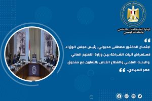 1) عقد الدكتور مصطفى مدبولي، رئيس مجلس الوزراء، اجتماعا؛ لاستعراض آليات الشراكة بين وزارة التعليم العالي والبحث العلمي والقطاع الخاص بالتعاون مع صندوق مصر السيادي، بحضور كل من الدكتورة هالة السعيد، وزيرة التخطيط والتنمية الاقتصادية، والدكتور أيمن عاشور، وزير التعليم العالي والبحث العلميّ،وخلال الاجتماع، تم استعراض عدد من المقترحات الخاصة بالشراكة بين الدولة والقطاع الخاص، والعوائد المتوقعة جراء تنفيذ تلك الشراكات، ووجه رئيس الوزراء بعرض هذه الآليات على اجتماع مجلس الوزراء، لأخذ الموافقة عليها؛ تمهيدا لتنفيذها.