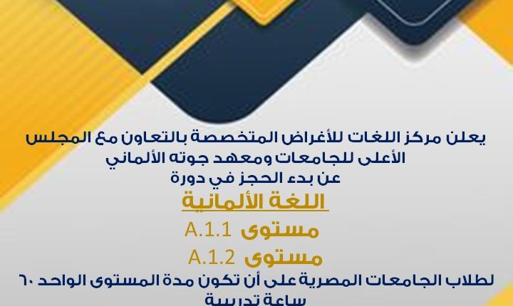 يعلن مركز اللغات للأغراض المتخصصة بالتعاون مع المجلس الأعلى للجامعات ومعهد جوته الألماني عن بدء التسجيل في دورات اللغة الألمانية مستوى 1.1.A ومستوى 1.2.A لطلاب الجامعات المصرية.