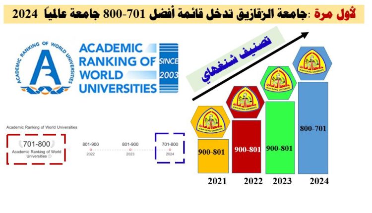 أظهر تصنيف شنغهاي الدولي لعام 2024 إنجازاً غير مسبوقاً لجامعة الزقازيق، حيث قفزت الجامعة هذا العام مئة مركز عالمي مقارنةً بالعام الماضي ، حيث كانت ضمن قائمة أفضل 800-901 جامعة عالمية، لتصبح هذا العام ضمن قائمة أفضل 701-800 جامعة على مستوى العالم من بين أكثر من 25 ألف جامعة تُقَيم عالميًا، ومن بين ثماني جامعات مصرية تم إدراجهم في هذا التصنيف.