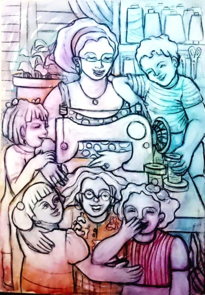 وعبرت الفنانة ريم جمال عبد الناصر عن المرأة المصرية المكافحة، باعتبارها تجسيدا للعمل والإرادة والعزيمة، سواء فى البيت (تطبخ وتعجن وتخبز)، أو فى خارج البيت تخيط أو تطرز الملابس، فكانت الماكينة رمزا لتجسيد عملها الدءوب.