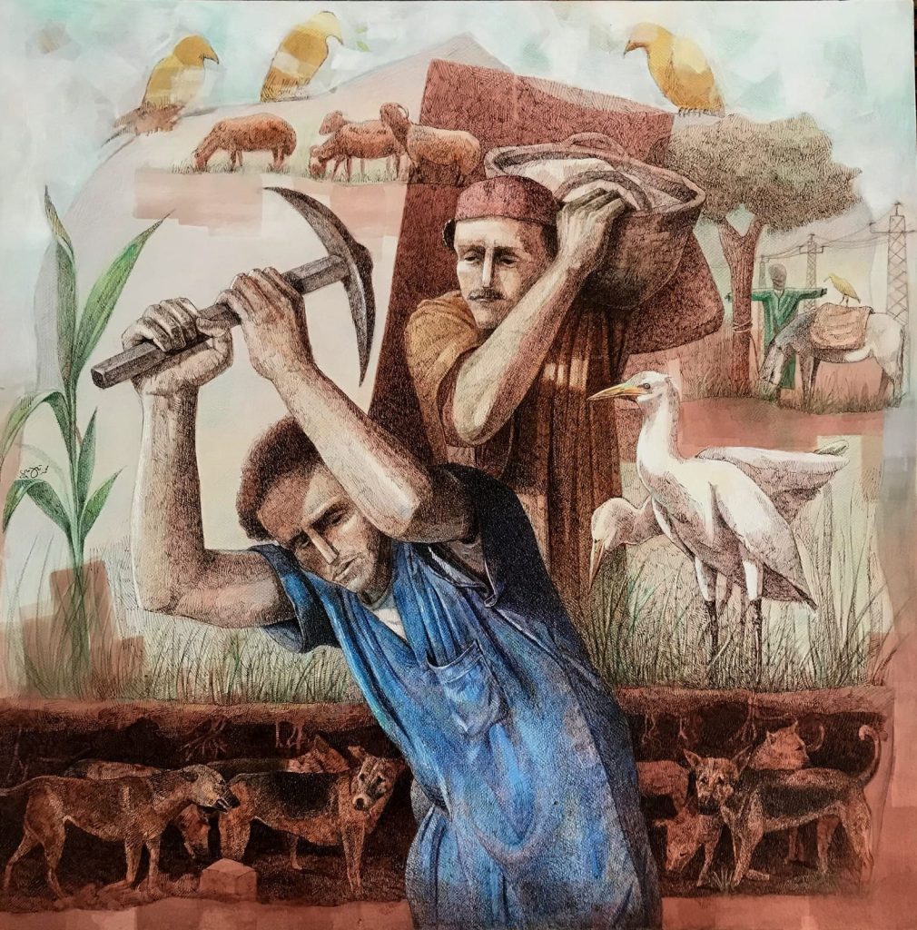 من جانبه تحدث الفنان التشكيلى محمد التهامى قائلا: سعيت إلى تقديم رؤية بصرية معاصرة لعيد العمال، لا من خلال الرموز التقليدية أو الشعارات الاحتفالية، بل عبر الغوص فى تفاصيل التعب الإنساني، وتجسيد جوهر الكدّ اليومى الذى يرافق العامل فى صمته ومجهوده، حيث اخترت أن أعبّر عن هذه المناسبة من خلال رسم شخصيات واقعية تمارس أعمالها بمشاعر حقيقية لم تكن وجوههم مزيّنة بالفرح مثقلة بملامح الجهد، وأجسادهم منحنية بحركة تعبّر عن المثابرة.