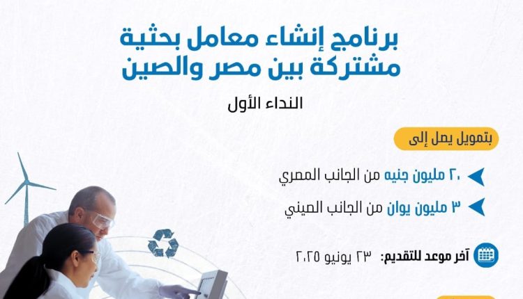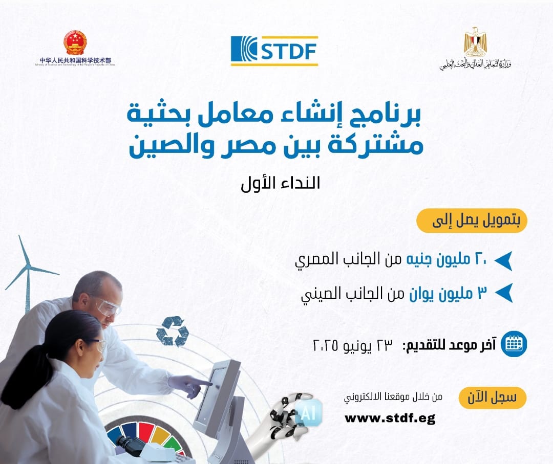 أعلنت هيئة تمويل العلوم والتكنولوجيا والابتكار (STDF)، بالتعاون مع وزارة العلوم والتكنولوجيا بجمهورية الصين الشعبية، عن فتح باب التقدم للنداء الأول لبرنامج “إنشاء معامل بحثية مشتركة بين مصر والصين”، والذي يهدف إلى تعزيز التعاون العلمي والتكنولوجي طويل الأمد بين المؤسسات البحثية في البلدين.