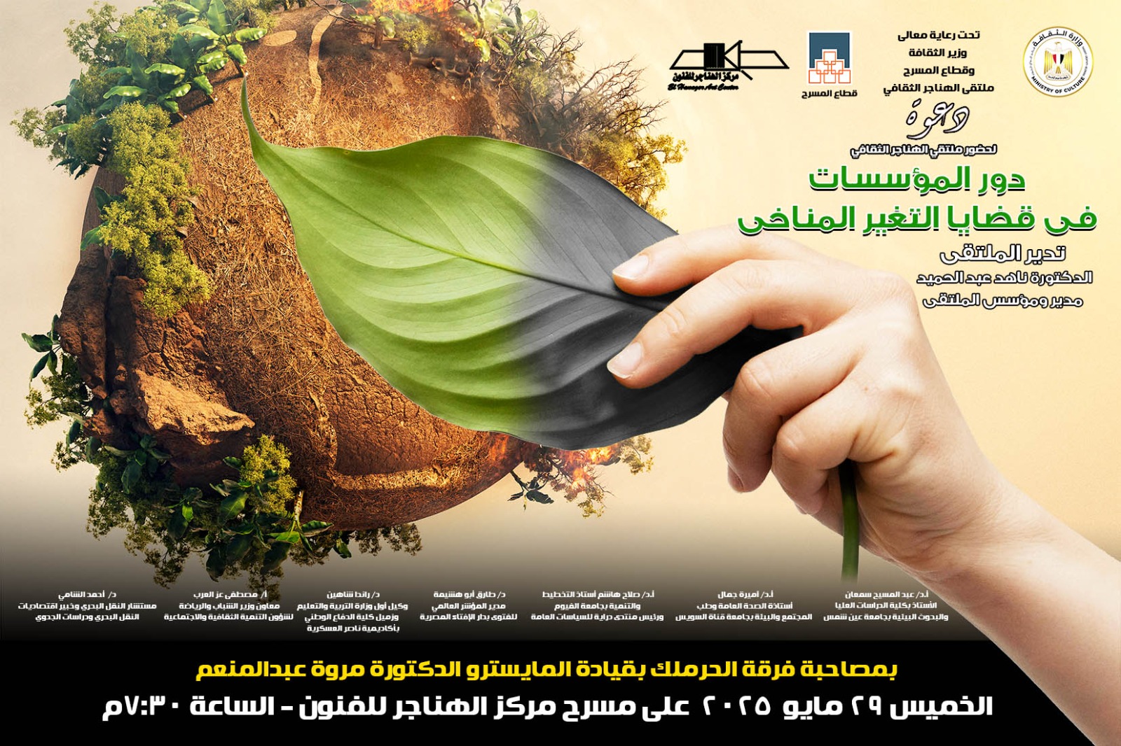 تحت رعاية الدكتور أحمد فؤاد هنو ، وزير الثقافة؛ ينظم قطاع المسرح برئاسة المخرج : خالد جلال ملتقى الهناجر الثقافى الشهرى بعنوان: دور المؤسسات فى قضايا التغير المناخى وذلك في تمام الساعة السابعة والنصف من مساء الخميس الموافق 29 مايو الجاري 2025 بمركز الهناجر للفنون بدار الأوبرا المصرية تحت إشراف الفنان شادي سرور مدير المركز .