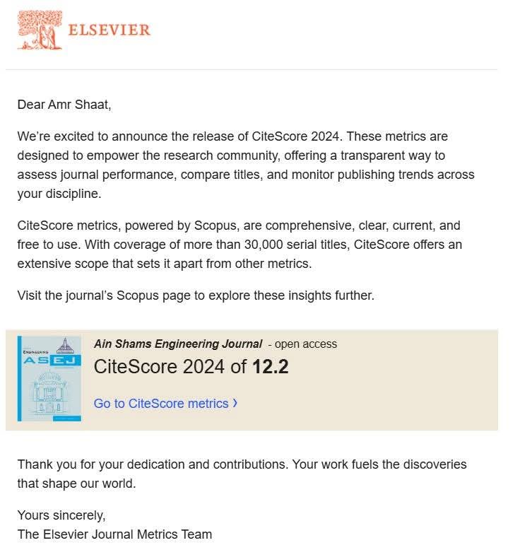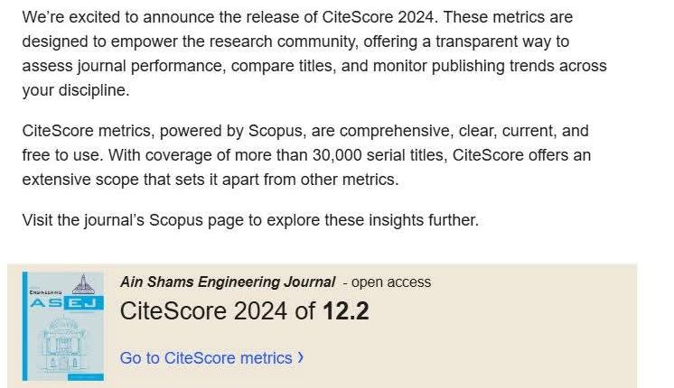 حيث ارتفع معدل الاستشهاد العلمي (Cite Score) للمجلة ليصل إلى 12.2 لعام 2024-2025، مقارنة بـ 10.8 في العام السابق، مما ساهم في تقدم تصنيف المجلة لتصبح ضمن أفضل 6% من المجلات الهندسية في مجال التخصص العام على مستوى العالم.