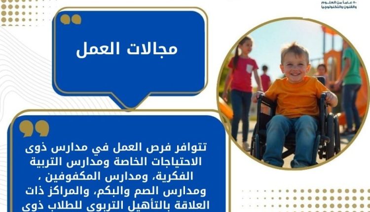 كما يؤهلهم أكاديميًا ومهنيًا بالتدريب في مدارس ذوى الاحتياجات الخاصة ومدارس التربية الفكرية، ومدارس المكفوفين ، ومدارس الصم والبكم، والمراكز ذات العلاقة بالتأهيل التربوي للطلاب ذوي الاحتياجات الخاصة.