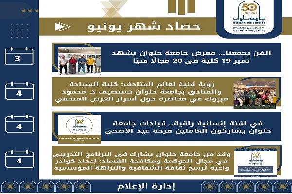 وفي “الأنشطة الطلابية”، اختتمت الجامعة فعاليات مهرجان اليوم الثقافي، وكانت كليتا آداب وتمريض في المركز الأول، كما أعلنت الجامعة النتيجة النهائية للمسابقة القمية السادسة لطلاب الأسر بالجامعات المصرية، التي أُقيمت تحت شعار “معًا لصحة أفضل”، بهدف تعزيز وعي الطلاب بأهمية الحياة الصحية وأسلوب الحياة المتوازن، وأسفرت النتائج عن فوز مينا عادل عطية من جامعة حلوان بالمركز الأول، كما اختتمت الجامعة فعاليات مهرجان الأسر الطلابية لعام 2025، بالاضافة إلى ختام فعاليات المعرض العام للفنون التشكيلية والأسرية في دورته الـ49، كما نظم مركز التميز للأشخاص ذوي الإعاقة دورة ريادة الأعمال: تمكين ودمج وتمهيد لجيل يصنع القرار بالتعاون مع مؤسسة هانس زايدل الألمانية بمصر وذلك في إطار تعزيز مبدأ الدمج المجتمعي والتنمية الشاملة.