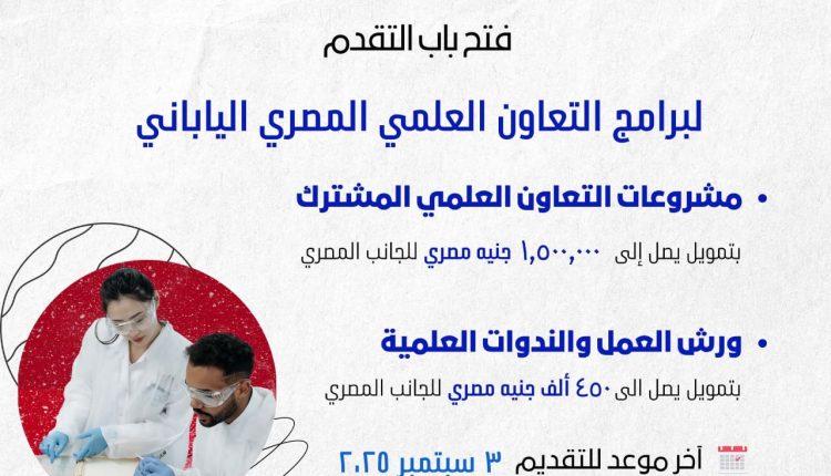 أعلنت هيئة تمويل العلوم والتكنولوجيا والابتكار (STDF) بالتعاون مع الجمعية اليابانية لتعزيز العلوم (JSPS) عن فتح باب التقدم لبرامج التعاون العلمي المشترك بين مصر واليابان، وذلك في إطار دعم العلاقات العلمية الدولية وتعزيز قدرات الباحثين المصريين.