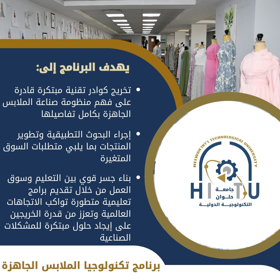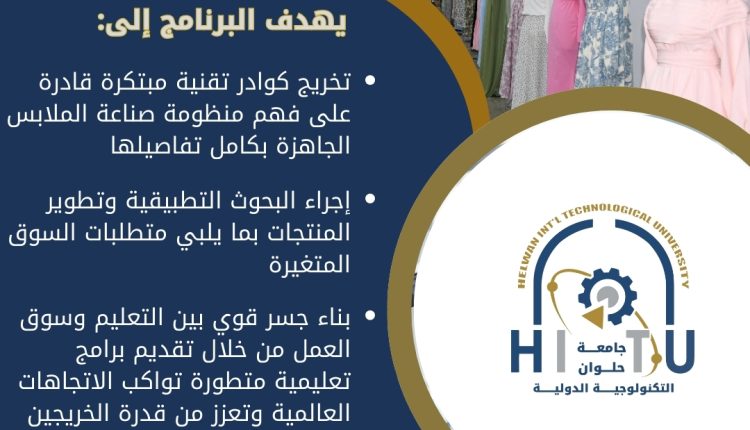 في ظل التوسع الكبير في البرامج التعليمية المتخصصة وحرص الجامعات التكنولوجية على مواءمة مخرجات التعليم مع متطلبات سوق العمل المحلية والدولية، تبرز جامعة حلوان التكنولوجية الدولية كأحد الصروح الرائدة التي تسعى لإعادة تعريف مفهوم التعليم التطبيقي من خلال برنامجها الفريد تكنولوجيا الملابس الجاهزة.