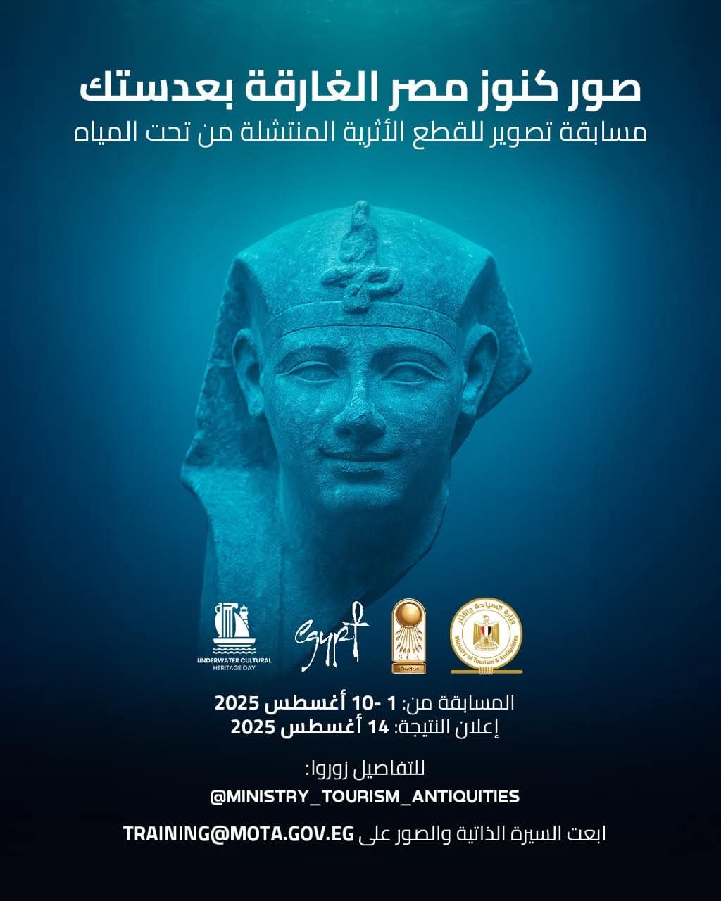 لتسليط الضوء على التراث الثقافي المغمور بالمياه، تطلق وزارة السياحة والآثار، بدءاً من غداً الجمعة الموافق 1 أغسطس 2025، مسابقة لهواة التصوير الفوتوغرافي، لاختيار أفضل صورة تُبرز إحدى القطع الأثرية التي تم انتشالها من مياه البحر المتوسط والمعروضة حاليًا بالمتحف اليوناني الروماني أو متحف الإسكندرية القومي.