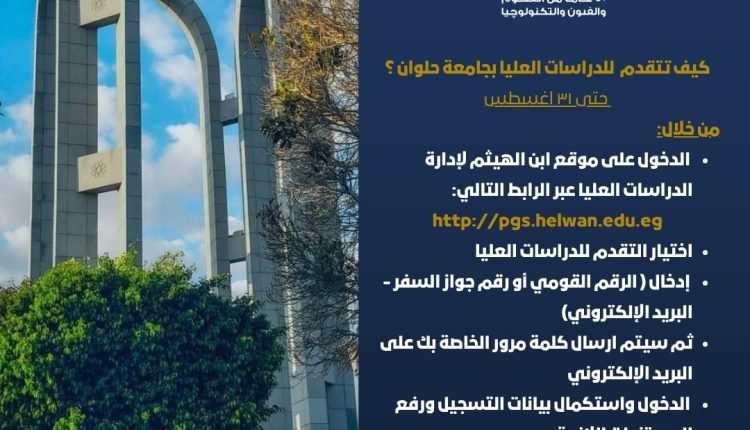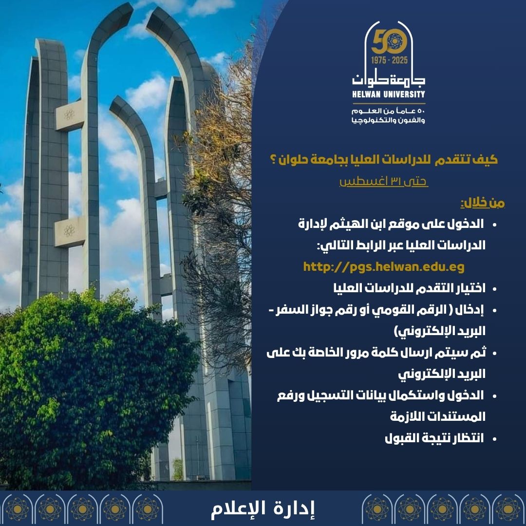 تعلن جامعة حلوان عن فتح باب التقدم للالتحاق بالدراسات العليا للعام الجامعي ٢٠٢٥/٢٠٢٦، وذلك تحت رعاية الدكتور السيد قنديل رئيس الجامعة، والدكتور عماد أبو الدهب نائب رئيس الجامعة للدراسات العليا والبحوث.