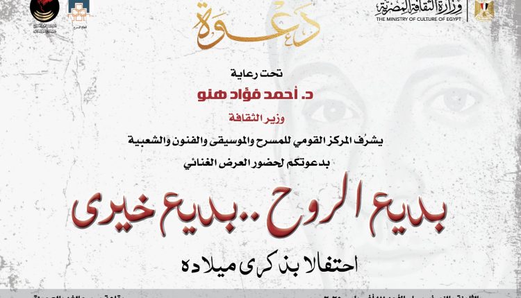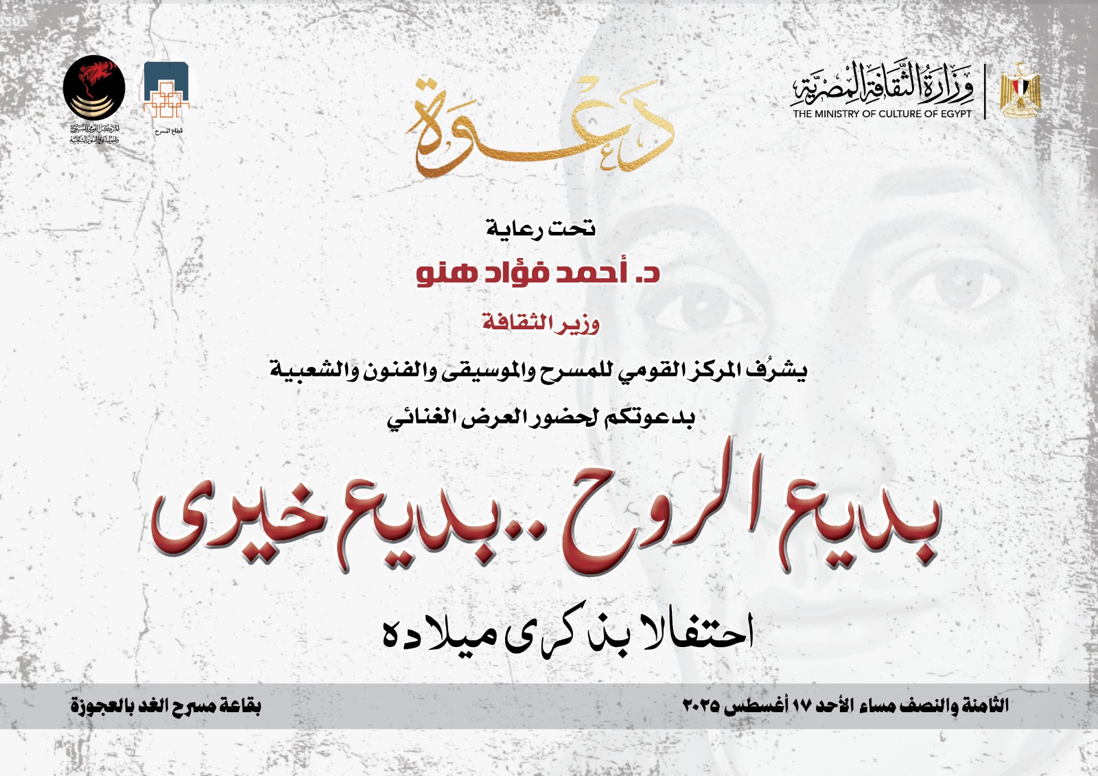 قام المخرج عادل حسان ، مدير المركز القومي للمسرح والموسيقي والفنون الشعبية ، بتوجيه الدعوة للجمهور لحضور عرض الحكي والغنا احتفالا بذكري ميلاد المبدع الراحل بديع خيري في الثامنة والنصف مساء الأحد القادم 17 أغسطس 2025 بقاعة مسرح الغد بالبالون- العجوزة.