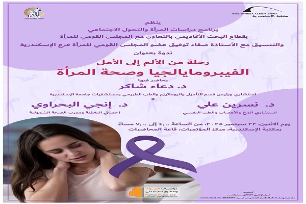 تنظم مكتبة الإسكندرية من خلال برنامج دراسات المرأة والتحول الإجتماعي بقطاع البحث الأكاديمي ندوة بعنوان: “رحلة من الألم إلى الأمل” الفيبرومايالجيا وصحة المرأة، بالتعاون مع المجلس القومي للمرأة وبالتنسيق مع الأستاذة صفاء توفيق عضو المجلس القومي للمرأة فرع الإسكندرية وذلك يوم الاثنين 22 سبتمبر 2025 ، من الساعة 4,00 إلى 7,00 مساءً بمكتبة الإسكندرية، مركز المؤتمرات، قاعة المحاضرات.
