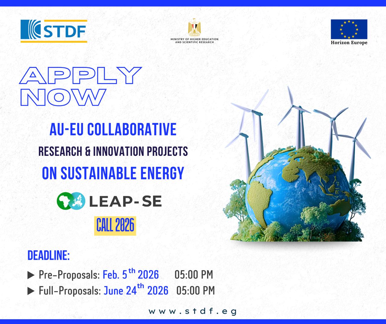 في هذا الإطار، تعلن هيئة تمويل العلوم والتكنولوجيا والابتكار (STDF) بالتعاون مع الاتحاد الأوروبي (EU) عن إطلاق النداء الثاني لبرنامج الشراكة طويلة الأجل بين الاتحاد الأوروبي والاتحاد الأفريقي للبحث والابتكار في الطاقة المستدامة (LEAP-SE 2026)، بتمويل يصل إلى ٣٠٠ ألف يورو للمشروع الواحد من الجانب المصري، وذلك بهدف دعم المشروعات المشتركة التي تُسهم في تعزيز الابتكار في مجال الطاقة النظيفة وربط الشراكات بين المؤسسات الأكاديمية والبحثية في أوروبا وأفريقيا.