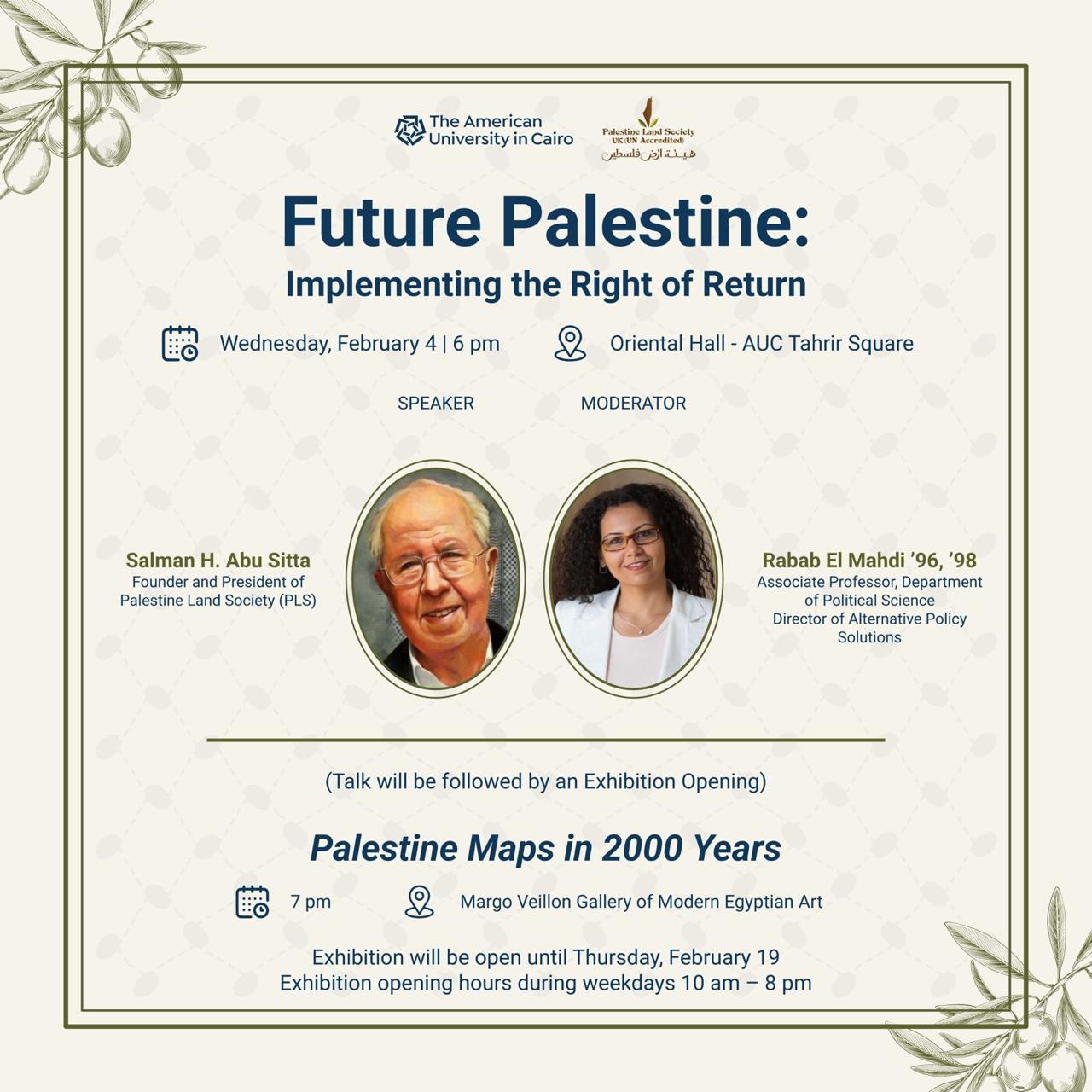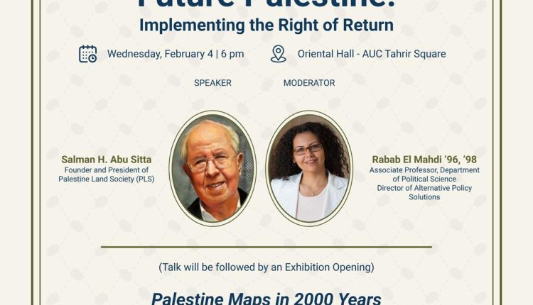تستضيف الجامعة الأمريكية بالقاهرة الدكتور سلمان أبو ستة، مؤسس ورئيس هيئة أرض فلسطين في لندن، في ندوة بعنوان «فلسطين المستقبل: نحو تطبيق حق العودة». تركز الندوة على كيف أن خمسة وسبعين عامًا من المنفى وعدم تطبيق القانون الدولي لم تنجح في تحقيق السلام في الشرق الأوسط، وتسلط الضوء على إطار مقترح لتطبيق القانون الدولي دون إحداث تهجير واسع النطاق للسكان القائمين، وذلك استنادًا إلى دراسة موسعة ديموغرافيًا وجغرافيًا واقتصاديًا قدمها أبو ستة إلى الأمم المتحدة. تدير الندوة الدكتورة رباب المهدي الأستاذ المشارك بقسم العلوم السياسية بالجامعة وخريجة دفعة ’96 ’98 ومديرة برنامج الحلول والسياسات البديلة.