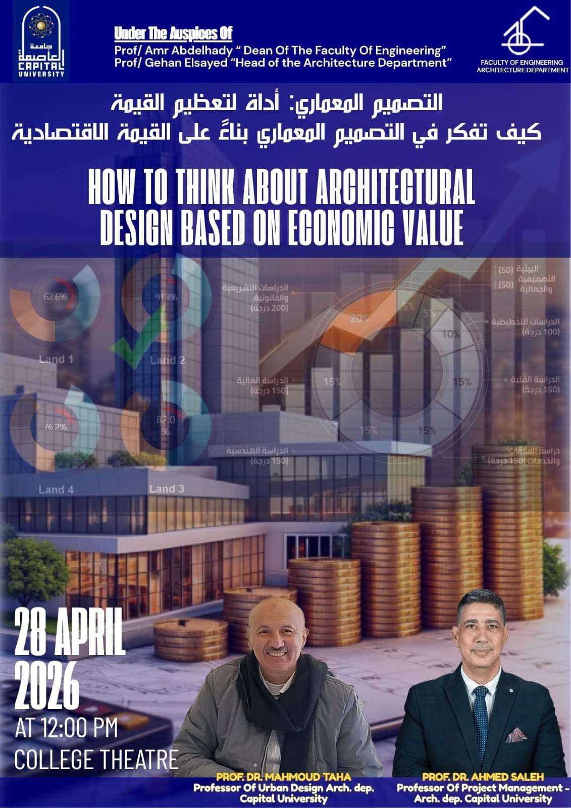 في إطار حرص جامعة العاصمة على دعم الأنشطة العلمية وتأهيل الطلاب والخريجين لمتطلبات سوق العمل، وتحت رعاية الأستاذ الدكتور السيد قنديل، رئيس الجامعة، والأستاذ الدكتور عمرو عبد الهادي، عميد كلية الهندسة بالمطرية، ينظم قسم الهندسة المعمارية بكلية الهندسة بالمطرية ندوة علمية متخصصة بعنوان: “التصميم المعماري أداة لتعظيم القيمة: كيف تفكر في التصميم المعماري بناءً على القيمة الاقتصادية” وذلك يوم الثلاثاء الموافق 28 أبريل 2026، في تمام الساعة الثانية عشرة ظهرًا، بمسرح الكلية، بمشاركة نخبة من الأساتذة والخبراء المتخصصين.