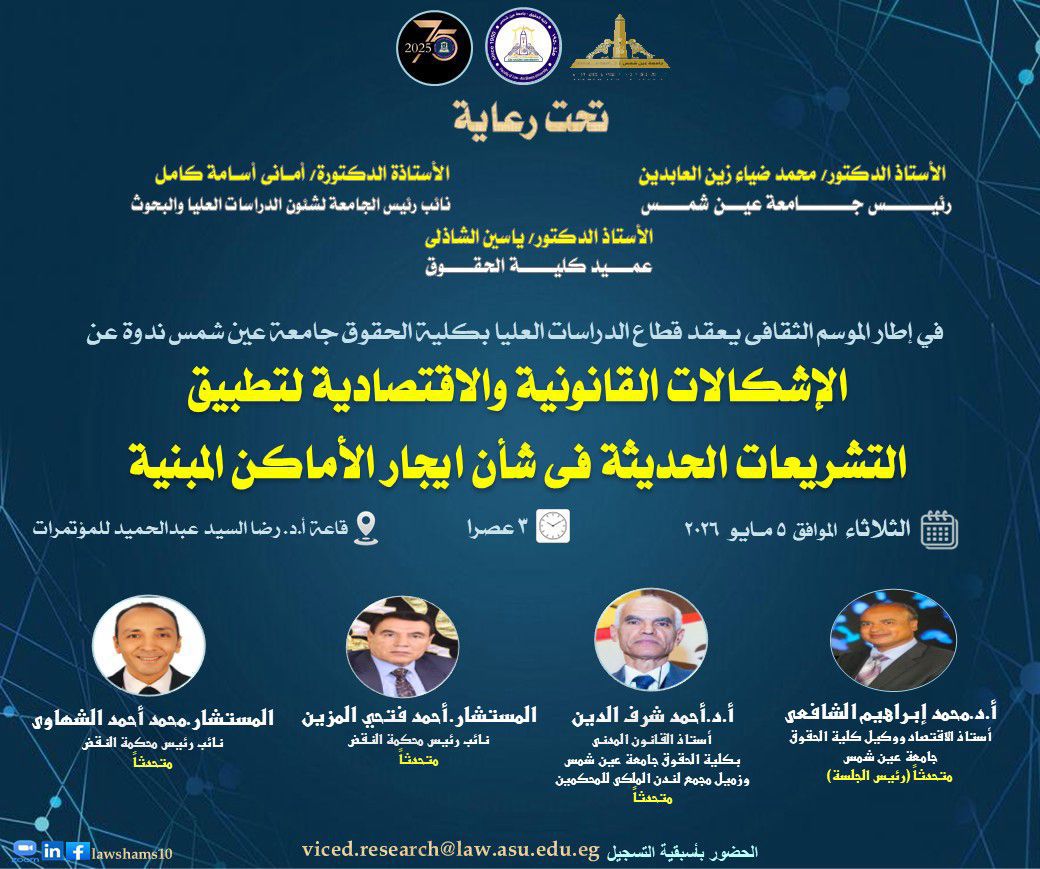 في إطار حراكها العلمي والمجتمعي المستمر، أعلن قطاع الدراسات العليا والبحوث بكلية الحقوق جامعة عين شمس عن تنظيم ندوة علمية متخصصة تحت عنوان “الإشكالات القانونية والاقتصادية لتطبيق التشريعات الحديثة في شأن إيجار الأماكن المبنية”، وذلك يوم الثلاثاء الموافق 5 مايو 2026.